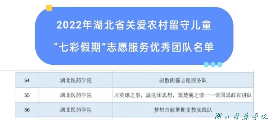 本网讯(通讯员 钟骅 向晓雨)近日,由团省委、团学联承办的2022年湖北省“三下乡”社会实践活动总结中湖北医药学院团委被评为“优秀组织单位”;湖北医药学院“筑”梦乡野社会实践队、湖北医药学院橙(承)红暑期社会志愿服务队、湖北医药学院药护学院精准·爱暑期社会实践队、湖北医药学院药护学院蒲公英为梦而生志愿服务队荣获“优秀团队”称号;第一临床学院王冬梅老师、第二临床学院2020级学生田彪、第一临床学院2020级学生黄焦博坤获“先进个人”称号。