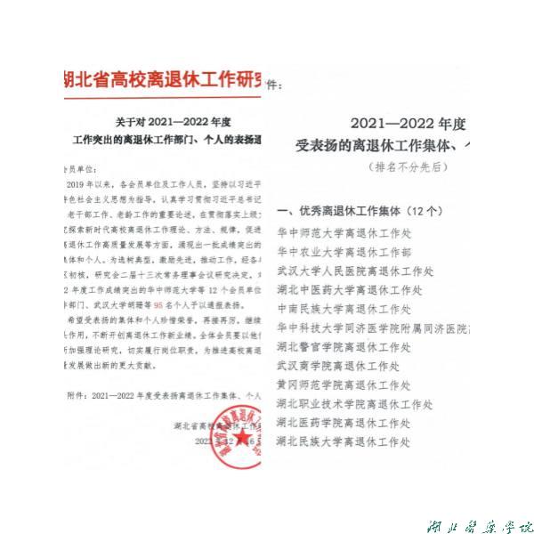本网讯(通讯员 付小红)近日,我校离退休工作处收到湖北省高校离退休工作研究会表扬通报:我校离退休工作处因工作突出,获湖北省高校2021--2022年度“优秀离退休工作集体”称号,我校原离退休工作处副处长焦延林同志获“优秀离退休工作个人”称号。在全省高校中,获“优秀离退休工作集体”称号的仅有12个。