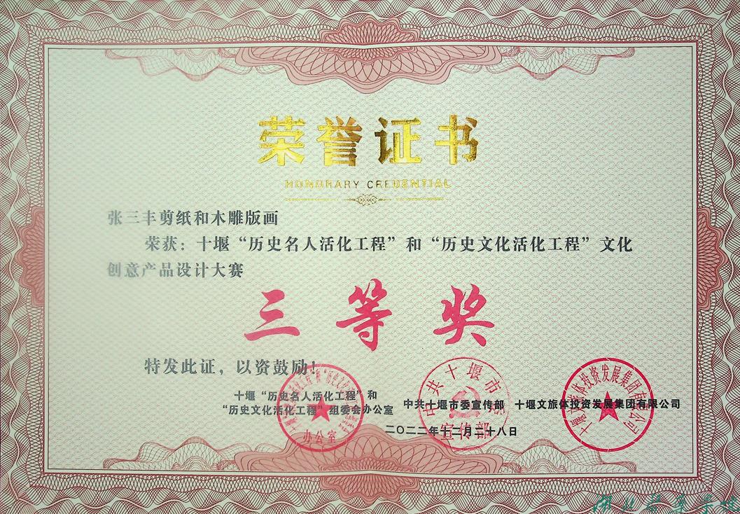 本次大赛由十堰“历史名人活化工程”和“历史文化活化工程”组委会办公室与市委宣传部共同主办,十堰文旅体投资发展集团有限公司等单位承办。自大赛启动以来,共收到来自全国各地团队及个人参赛作品300余件,其中文化产业创业项目70余份,文化创意产品设计220余份。通过初评筛选、网络投票、现场路演等环节,最终评选出文化创意产品设计一等奖2名、二等奖5名、三等奖8名、优秀奖20名。经过激烈的角逐,邵文涛设计的《张三丰剪纸和木雕版画》在众多的参赛作品中脱颖而出,取得三等奖的好成绩。这是我校积极践行文化传承、服务社会职能的具体呈现,也是实施校园文化建设的特色成果,展现了我校职工敢创会创的精神风貌。今后,学校将继续加强校园文化建设,推动产教融合、深化校企合作、增强校际交流、提升相关专业内涵质量,引导广大师生积极参加各类创新创业大赛,进一步提升创新型应用型人才培养,为地方经济社会发展培根铸魂、润城化人、贡献新的智慧与力量。