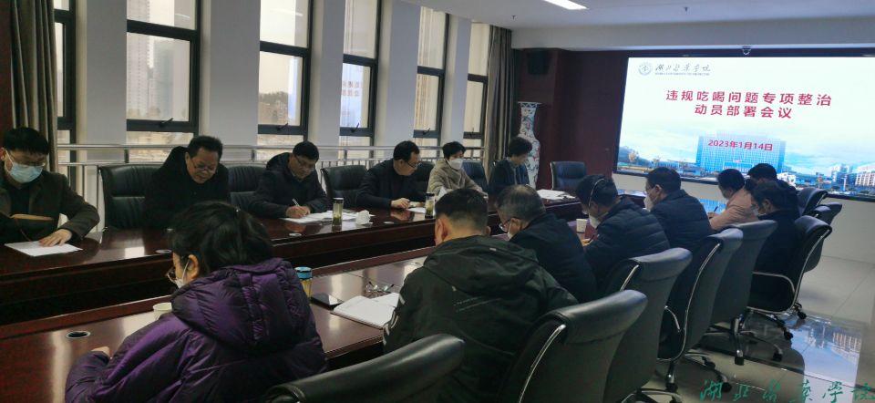 本网讯(通讯员 付轶)为贯彻落实湖北省委《关于在全省开展违规吃喝问题专项整治的工作方案》要求,1月14日上午,学校召开了违规吃喝专项整治动员部署会议。党委副书记、校长王云甫,党委常委、副校长严世荣,党委常委、组织部部长张海蛟出席会议。党政办、纪委、组织部、宣传部、人事处、教务处、财务处、资产处、后勤处、学工处、保卫处、科技处和研究生院等部门负责同志参加会议。会议由校纪委副书记余彬主持。