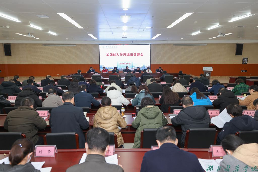 党委副书记、校长王云甫传达了全市加强能力作风建设动员大会精神,要求全校党员干部以提升能力作风为契机,以起步就是冲刺、开局就是决战的奋进姿态,全力以赴推进全年重点工作。党委常委、组织部部长张海蛟从指导思想、工作目标、主要举措、工作安排、组织保障五个方面,对学校《关于加强能力作风建设的实施方案》进行了解读和说明。