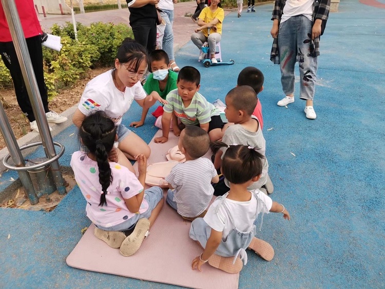 湖北医药学院“彩虹”灾害医学救援志愿服务队王万荣在社区为居民开展救急知识培训