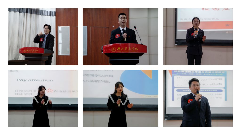 本次比赛由十堰市打击治理电信网络诈骗犯罪联席会议办公室主办,共青团湖北医药学院委员会承办,十堰市公安局反诈中心协办。比赛中,十位参赛选手按照抽签顺序依次上台演讲,他们从电信网络诈骗定义、常见的电信网络诈骗手法及防范措施、学校防范电信网络诈骗活动开展等方面展开演讲,将电信网络诈骗的特点立体、生动地呈现在大家面前,展现出防范电信网络诈骗宣传大使思维灵活、勇于担当、心系同学的形象。