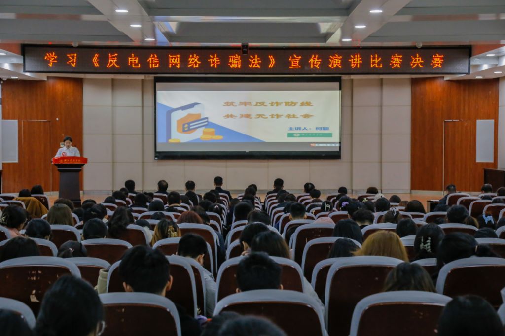 本网讯(通讯员 唐闫阳 闵思彤)3月16日下午,我校于八号楼多功能厅举行“筑牢反诈防线 共建平安校园”《反电信网络诈骗法》宣传演讲大赛决赛。党委常委、组织部部长张海蛟,十堰市公安局反诈中心负责人毛群,校保卫处、学工部、团委,各学院分管学生工作的领导参与本次活动。