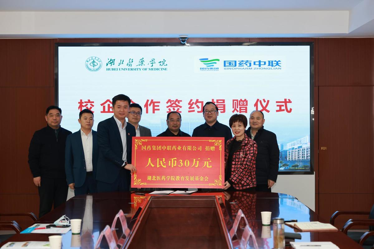 湖北医药学院党委常委、副校长、教育发展基金会理事长严世荣代表学校与国药集团中联药业有限公司签订捐赠协议。