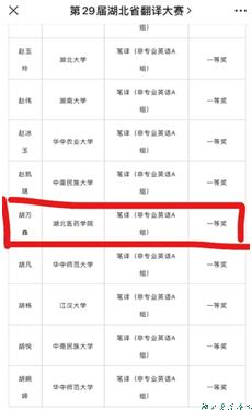 本网讯(通讯员 薛军锋)近日,第二十九届湖北省翻译大赛决赛成绩揭晓,我校第一临床学院2021级的胡万鑫同学喜获非专业英语A组笔译组一等奖。