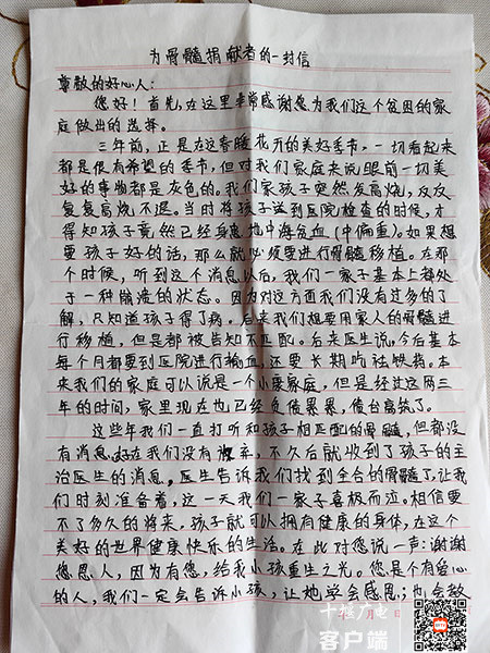 小寒告诉记者,信的内容让人动容,本应是一个无忧无虑享受生活的小朋友,在出生不久患上了血液病,可想而知她的家庭遭受了多大的打击,正是这次造血干细胞的配型成功,给她带来了生的希望,让她以后可以健康成长,享受美好生活,他认为自己的付出很值得。