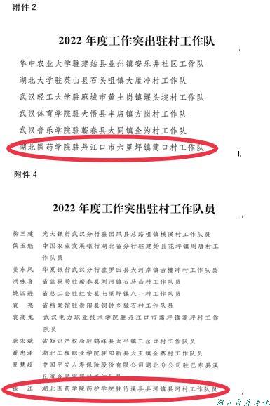本网讯(通讯员 柯琴)近日,湖北省乡村振兴局、省委组织部等四部门联合发文,对2022年度省派驻村工作先进集体和先进个人进行了通报表扬。我校驻丹江口市六里坪镇蒿口村工作队获2022年度工作突出驻村工作队,药护学院驻竹溪县县河镇县河村工作队员钱江获2022年度工作突出驻村工作队员。