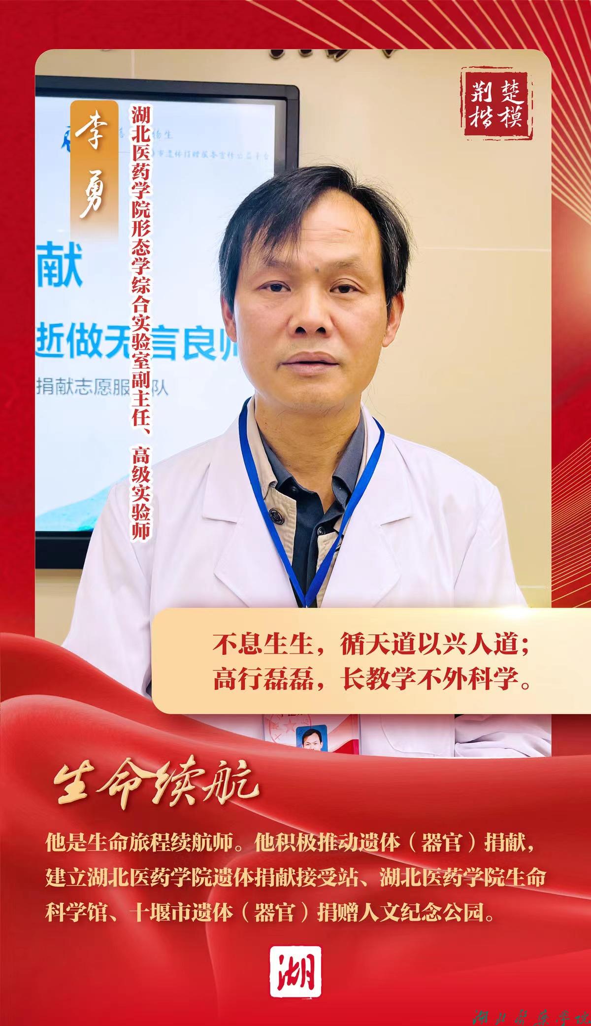 30多年来,他一直坚持解剖教学工作,爱岗敬业,态度严谨。在教学之余,他热心公益,长期开展遗体(器官)捐献宣传、协调、服务工作。推动建立了湖北医药学院遗体捐献接受站、湖北医药学院生命科学馆、十堰市遗体(器官)捐赠人文纪念公园,指导成立了“巨鲸落·万物生”十堰市遗体(器官)捐献志愿服务队,长期开展生命科学科普讲解和遗体器官捐献文化志愿服务。2022年,志愿服务队成功入选全国300支大学生科技志愿服务示范团队,李勇老师获“2022年度十堰市红十字优秀志愿者”称号。2023年初,他被评为“中国红十字志愿服务先进典型代表”,是湖北省第十位获此殊荣的全国先进典型。2023年4月初,他被市委宣传部、市文明办授予“十堰好人·楷模”荣誉称号。