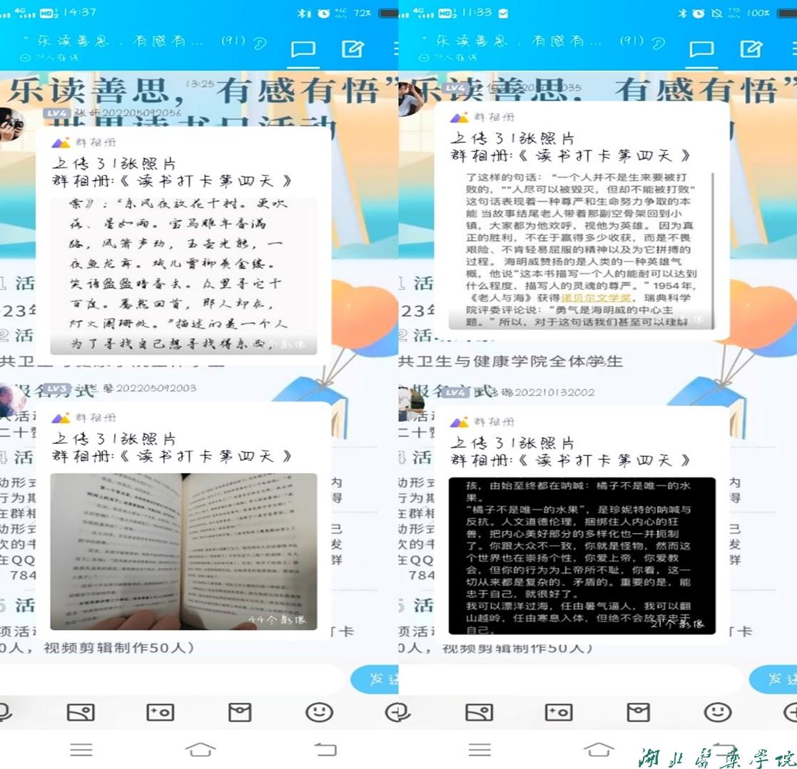 活动期间,同学们在QQ群里连续一周打卡阅读日常,共同分享阅读心得体会。另外,同学也通过视频的形式朗诵自己喜欢的书中语段,声情并茂地向大家展示喜欢的文字。活动吸引了众多师生的热情参与,同学们在分享过程中,体会到阅读的乐趣,也结识了一群志同道合的朋友。