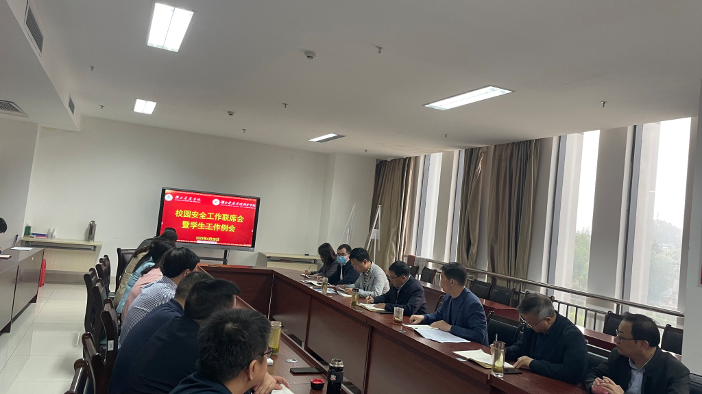 保卫处处长师贞明、学工部部长陈璞分别传达省市相关文件及会议精神。各学院汇报了近期排查的安全隐患和学生情况。相关职能部门回应了学院反馈的问题并就宿舍管理相关情况、校园交通安全、反电诈、禁毒、消防安全等工作进行说明。陈璞就疫情防控、劳动节假期和五月份学生安全管理、辅导员队伍建设等工作进行强调。
