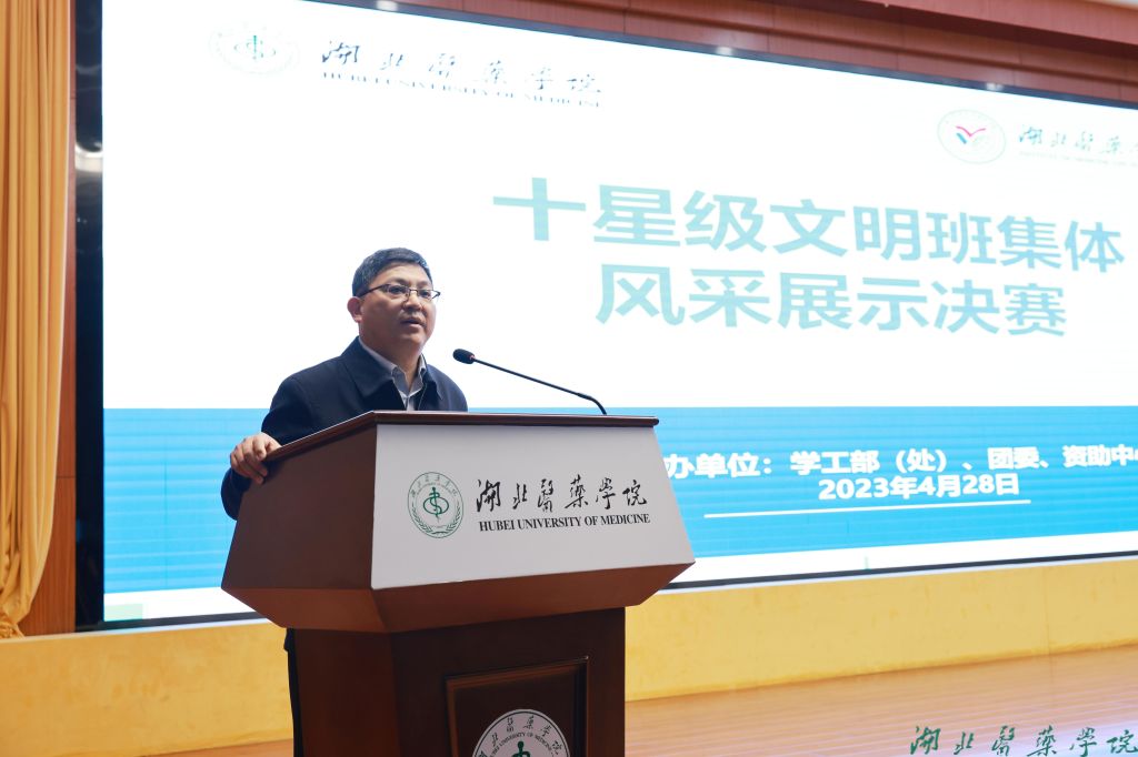 党委常委、组织部长张海蛟发表总结讲话,他认为本次十星级文明班集体风采展示大赛是一次迟到的展示、一次美好的展示、一次成功的展示。他表示,大赛彰显了同学们浓烈的集体观念,众人划桨开大船,众人拾柴火焰高,取得优异的成绩是班集体团队共同的努力;大赛彰显了同学们强烈的荣誉感,“红日初升,其道大光,河出伏流,一泻汪洋”,面对世纪疫情,青年在力量在,面对艰难险阻,青年在希望在;大赛彰显了同学们蓬勃的青春活力,“芳林新叶催陈叶,流水前波让后波”,展现出后疫情时代湖医药学子的昂扬风貌。
