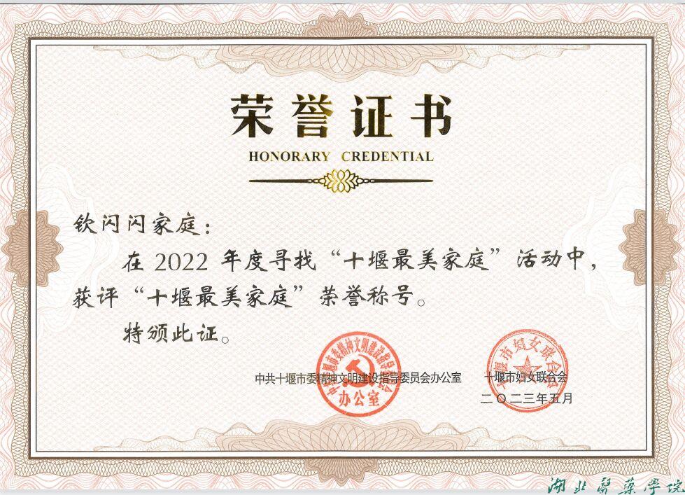 为深入贯彻落实习近平总书记关于家庭家教家风建设的重要论述,建设好家庭、涵养好家教、传承好家风,团结引领广大家庭弘扬新时代家庭观,市委文明办、市妇联联合在全市开展了2022年寻找“十堰最美家庭”系列活动。数万个家庭积极参与,涌现出一大批爱党爱国、清正廉洁、绿色环保、崇德向善的最美家庭典型。在众多的参评家庭中,我校基础医学院钦闪闪李丹丹家庭脱颖而出,获评“十堰清正廉洁最美家庭”称号,十堰市共评选30户。