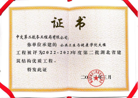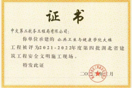 本网讯(通讯员 周艺)近日,我校公共卫生与健康学院大楼项目喜获湖北省建筑结构优质工程奖和湖北省建筑工程安全文明施工现场奖,这是公卫大楼项目继获得市级建筑结构优质工程奖和安全文明施工现场奖后,又荣获省级双奖。