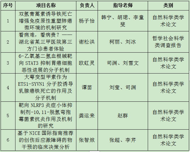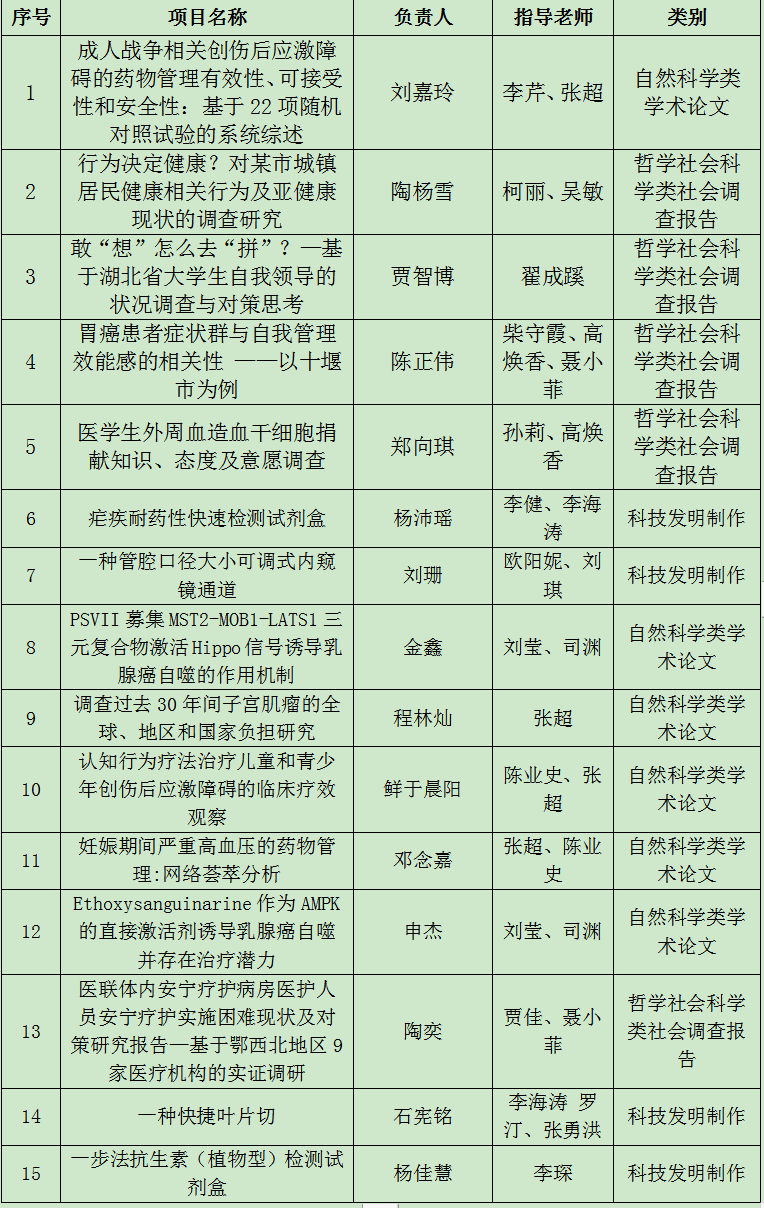 经过决赛比拼,我校李童斐、彭兴春和李贤玉老师指导的《“光控释药血小板”用于靶向递药及抗肿瘤的研究》(项目负责人:李祺睿),聂小菲、贾佳和张桃桃老师指导的《“健康中国”视域下安宁疗护机构护理质量现状及优化路径调研报告》(项目负责人:高洁)获得省赛一等奖。