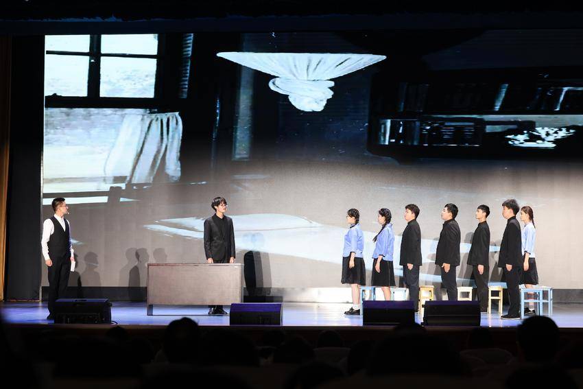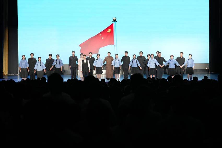 四幕话剧完美落幕,大学生艺术团合唱团和全体演职人员一起合唱歌曲《如愿》,悠扬歌声中,演员们逐个走上舞台,向观众敬礼,向新中国敬礼。