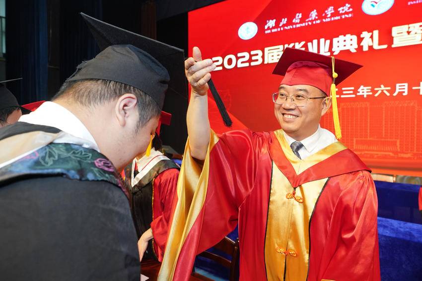 现场师生欢聚一堂,在一段段精心制作的MV和歌曲串烧中,共话对母校的不舍与留恋。毕业典礼在全体师生洪亮的国歌声中拉开帷幕。党委常委、统战部部长谭艳宣读学校2023届毕业生学位授予文件;党委常委、纪委书记徐荣宣读2023届优秀毕业生、优秀毕业生标兵表彰文件;党委常委、副校长严世荣,党委常委、副校长李云霞分别为优秀本科毕业生及标兵、优秀硕士毕业生及标兵颁奖;原党委书记涂汉军为2023届毕业生校友联络员颁发聘书。