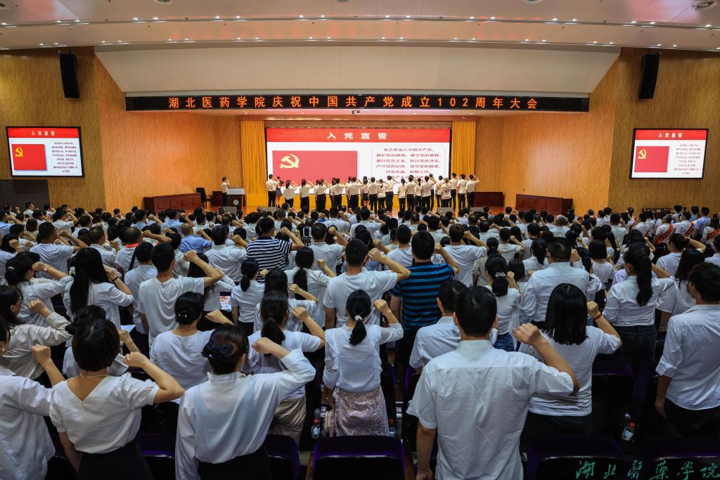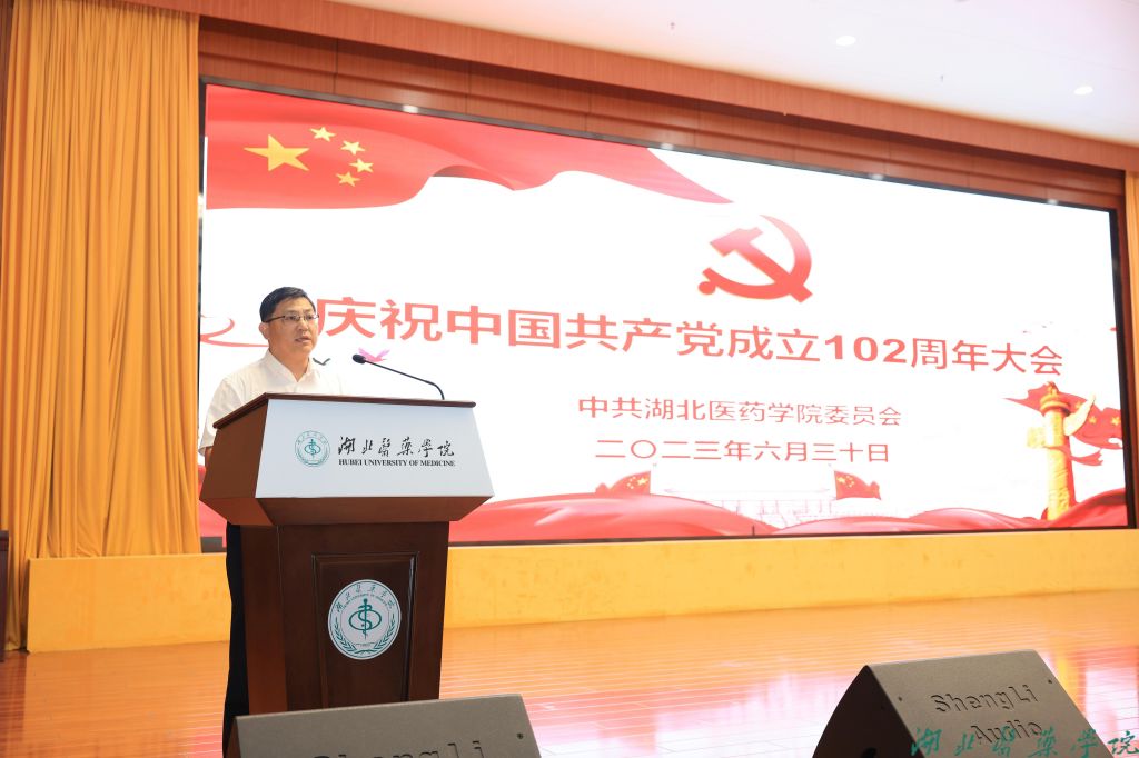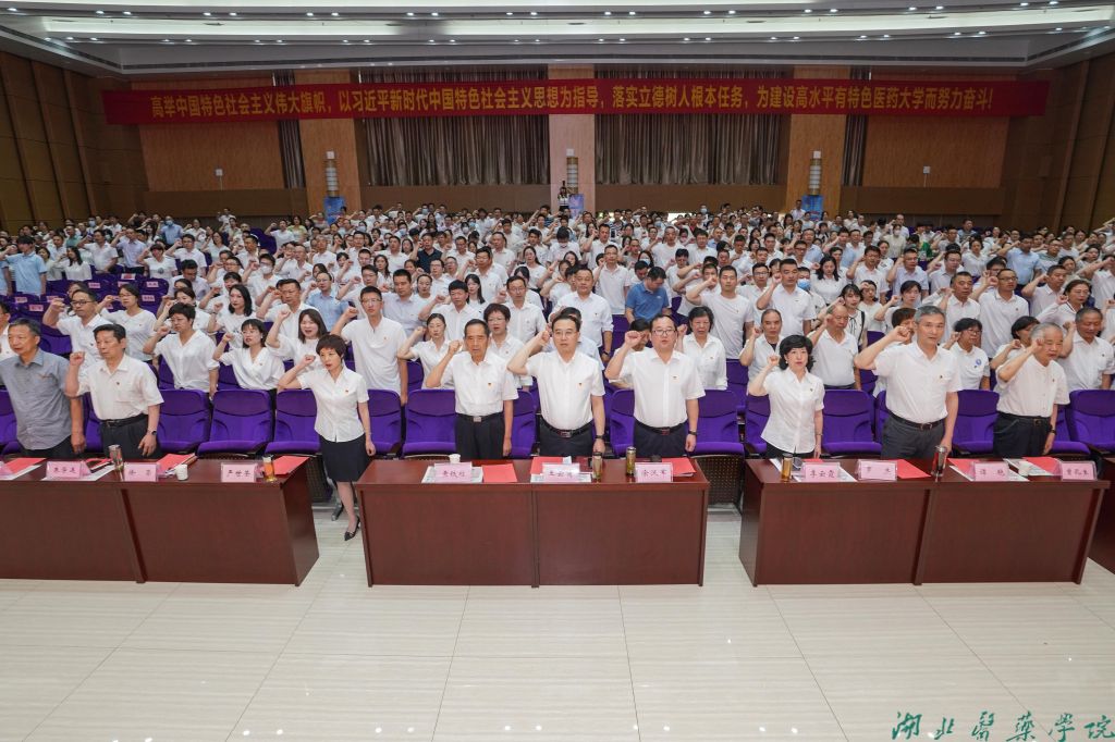 本网讯(图文 鲍晓宇)“我志愿加入中国共产党,拥护党的纲领,遵守党的章程,履行党员义务,执行党的决定……”入党誓词一字一句,声声入耳,铿锵有力。6月30日下午,湖北医药学院在科教楼学术报告厅举行庆祝中国共产党成立102周年大会,30名预备党员面向国旗庄严宣誓,跟随着湖北医药学院党委常委、纪委书记徐荣一同举起右手,目光坚定,掷地有声。在现场,有3位“光荣在党50年”的老同志,还有退休老领导、全体校领导、全体师生党员,在这个庄严的时刻,全体与会人员一同重温了入党誓词,响亮的喊出“宣誓人”的名字。这是一次集体的思想洗礼,这是一次对信仰的忠诚致敬。庆祝大会由党委常委、组织部部长张海蛟主持。