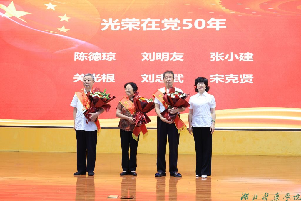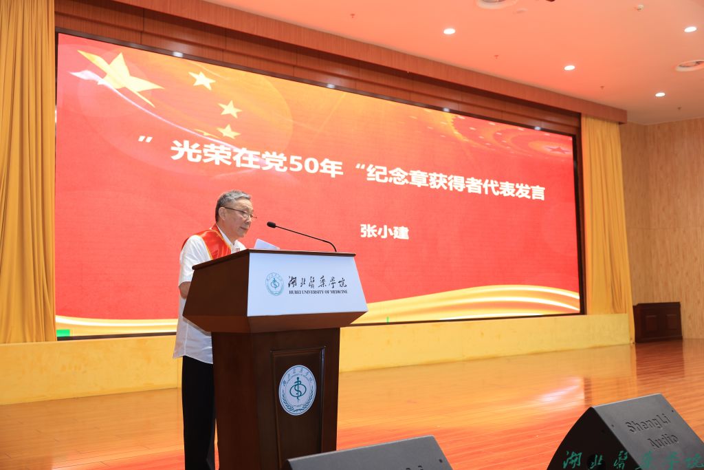 “光荣在党50年”纪念章获得者张小建同志上台发言,他讲到,作为湖北医药学院获得纪念章的老党员之一,心潮澎湃,感慨万千。他激动地说到,一枚小小的纪念章,是党对每位老党员的殷殷嘱托和丝丝记挂;一枚小小的纪念章,在他心中无比珍贵,它映照出作为一名老党员坚定的初心,诠释了老党员们一生跟党走的忠诚与信念。
