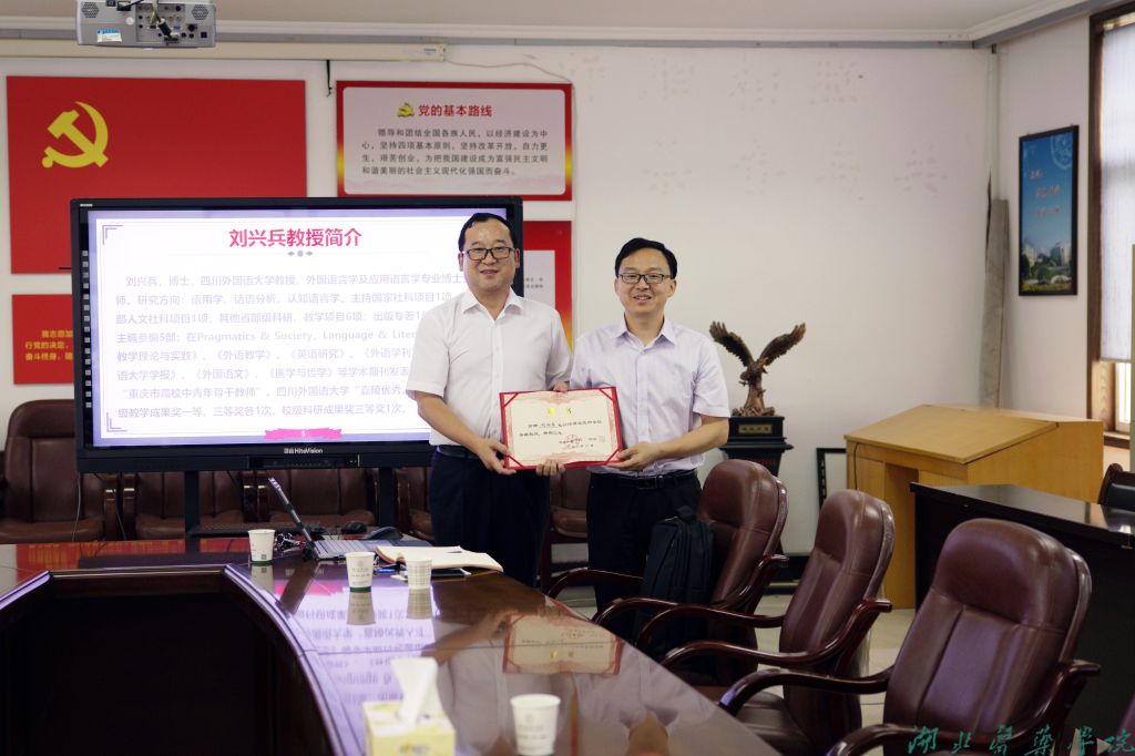 本网讯(文/傅珏 图/黄松鹤)6月29日下午,四川外国语大学博士生导师刘兴兵教授应邀来校进行学术交流,并为人文社会科学学院教师带来《国家社科项目申报技巧及经验分享》专题讲座。正校级干部、原党委书记涂汉军出席本次讲座并为刘兴兵教授颁发客座教授聘书。活动由人文社会科学学院院长刘冰主持。