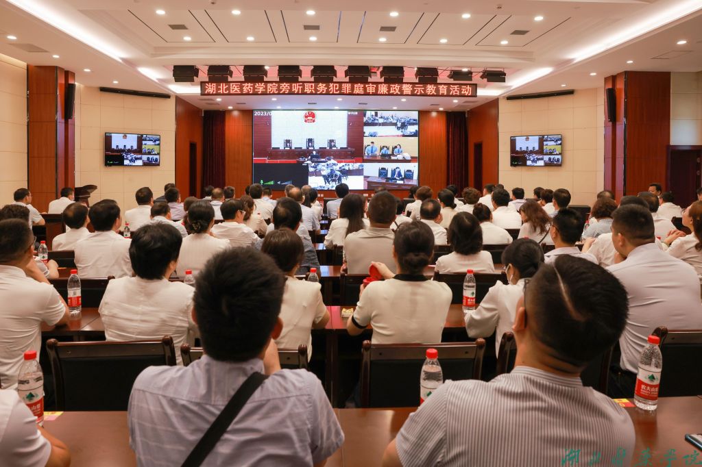 本网讯(文/郭震宁 图/郑建超)根据学校党风廉政建设宣传教育月活动总体安排,充分发挥“以案明纪”警示教育作用,7月5日上午,全体校领导、正副处级干部、纪委委员、分党委纪检委员、专职纪检干部,以及直属附属太和医院、直属附属人民医院干部代表100余人,赴十堰市中级人民法院参加旁听职务犯罪庭审警示教育活动。