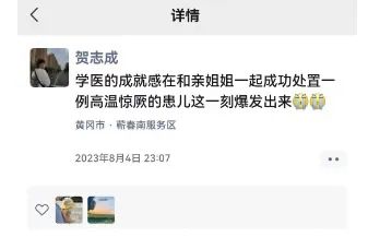 不久,警车将孩子送到附近的医院进行后续治疗。当晚11时,贺志成在朋友圈发了一条动态:“学医的成就感在和亲姐姐一起成功处置一例高温惊厥的患儿这一刻爆发出来。”