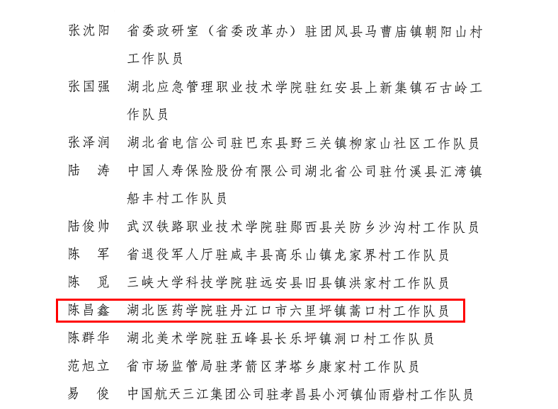 本网讯(通讯员 党雪峰)近日,湖北省委组织部、省委农村工作领导小组办公室、省农业农村厅、省乡村振兴局联合印发《关于表扬2021-2023年度省派驻村工作队期满考核先进个人的通报》,我校驻丹江口六里坪镇蒿口村工作队员陈昌鑫同志荣获“2021-2023年度省派驻村期满考核优秀工作队员”称号。