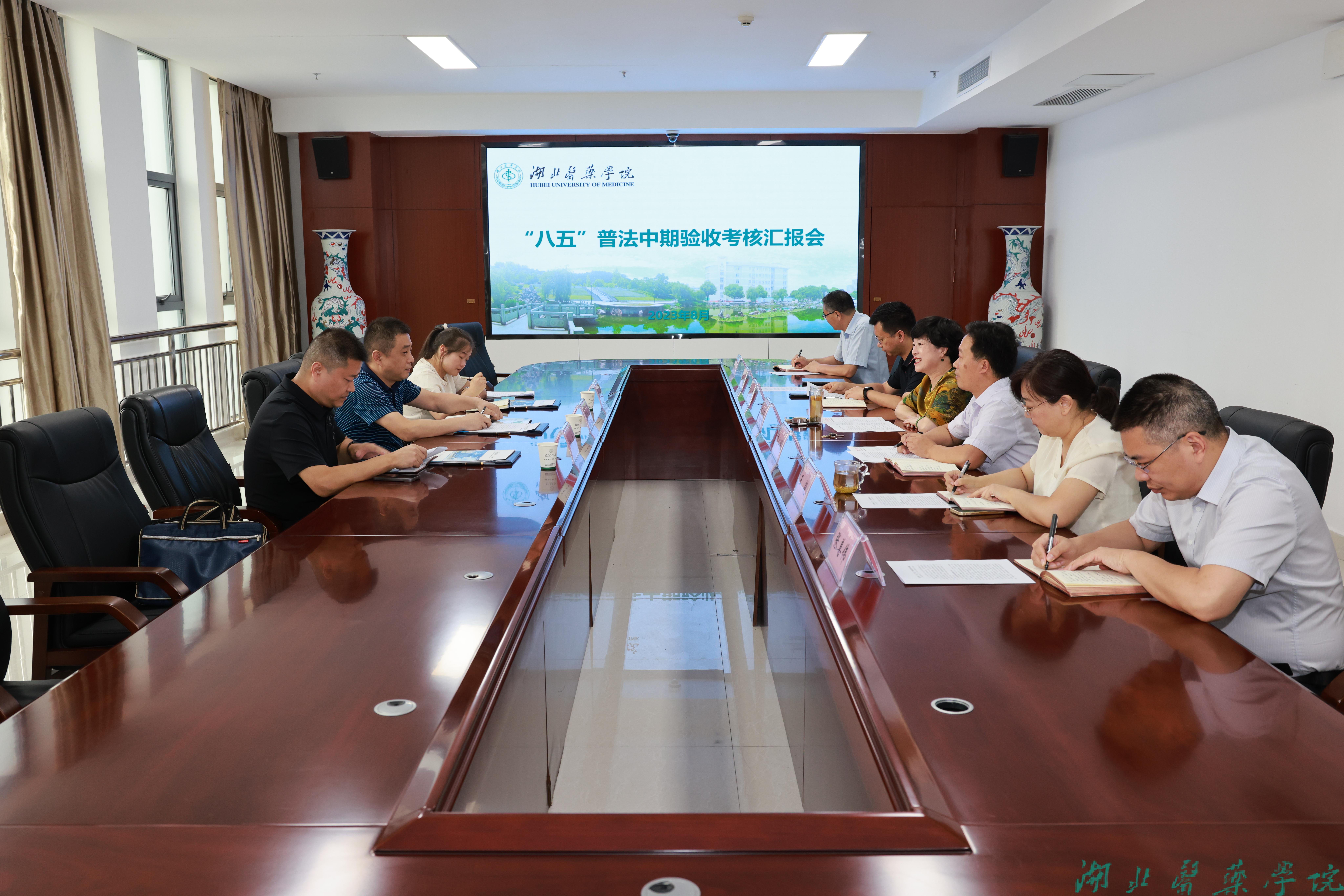 本网讯(通讯员 吕圣子)8月28日下午,十堰市“八五”普法中期验收第一考核组来校开展“八五”普法中期验收考核工作。本次考核组长为十堰市人大监察和司法委员会主任委员陶劲东。校党委常委、副校长李云霞,法规处、学工处、党政办、宣传部、人事处、保卫处等部门负责人出席汇报会。