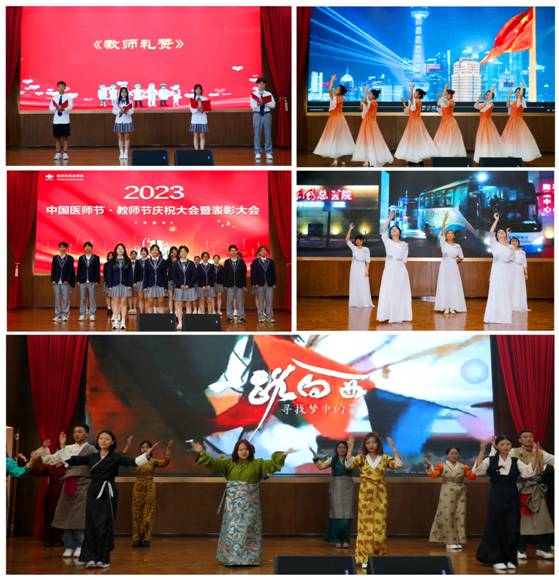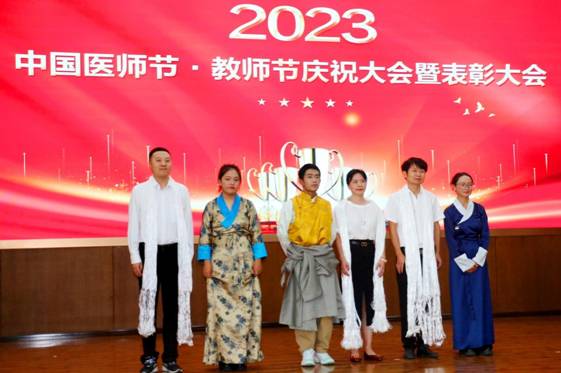 随后,第二临床学院学生为大家献上了一场精彩的文艺表演,将表彰大会气氛推向高潮。学院大学生艺术团带来诗歌朗诵《教师礼赞》、舞蹈表演《如愿》《追光者》、合唱《至少还有你》等节目,其中最引人注目的当属学院藏族学生为大家带来的舞蹈《幸福拉萨》,当地特色的原生态表演赢得掌声阵阵。为感谢附属医院为支援藏区医疗事业发展做出的贡献,藏族学生代表为援藏医生代表献上圣洁的哈达,深情表达了藏族同胞对附属医院十余年坚持不懈援藏、向藏区同胞送去温暖的大爱精神的崇高敬意。