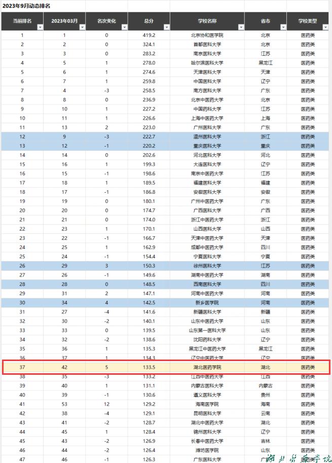 本网讯(文 郑建超)根据软科数据库新一轮动态数据显示,截至2023年9月份,湖北医药学院位居全国公办高校排名第281位(较2023年3月排名302名进位21位),位居医药类大学排名第37位(较2023年3月排名42名进位5位),位居湖北省高校排名第16位(较2023年3月排名19位进位3位),在湖北省内以学院命名的高校中排名第一。