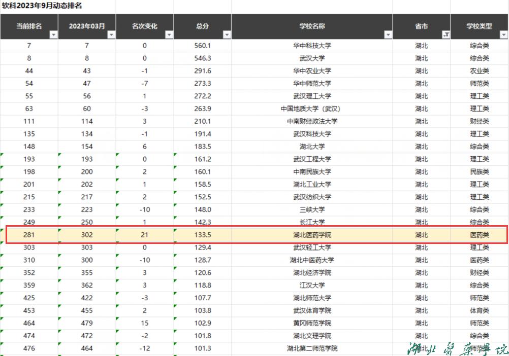本网讯(文 郑建超)根据软科数据库新一轮动态数据显示,截至2023年9月份,湖北医药学院位居全国公办高校排名第281位(较2023年3月排名302名进位21位),位居医药类大学排名第37位(较2023年3月排名42名进位5位),位居湖北省高校排名第16位(较2023年3月排名19位进位3位),在湖北省内以学院命名的高校中排名第一。