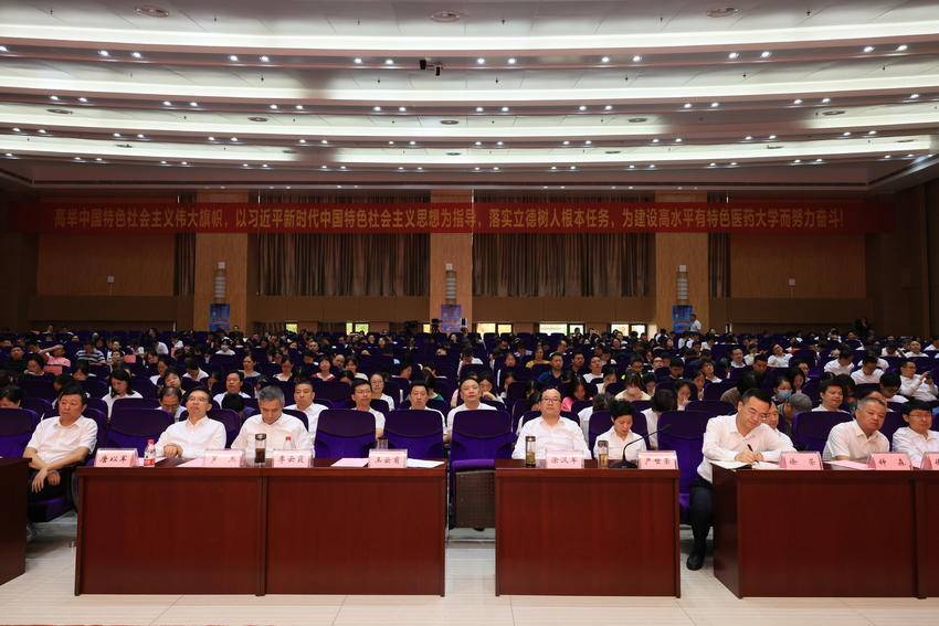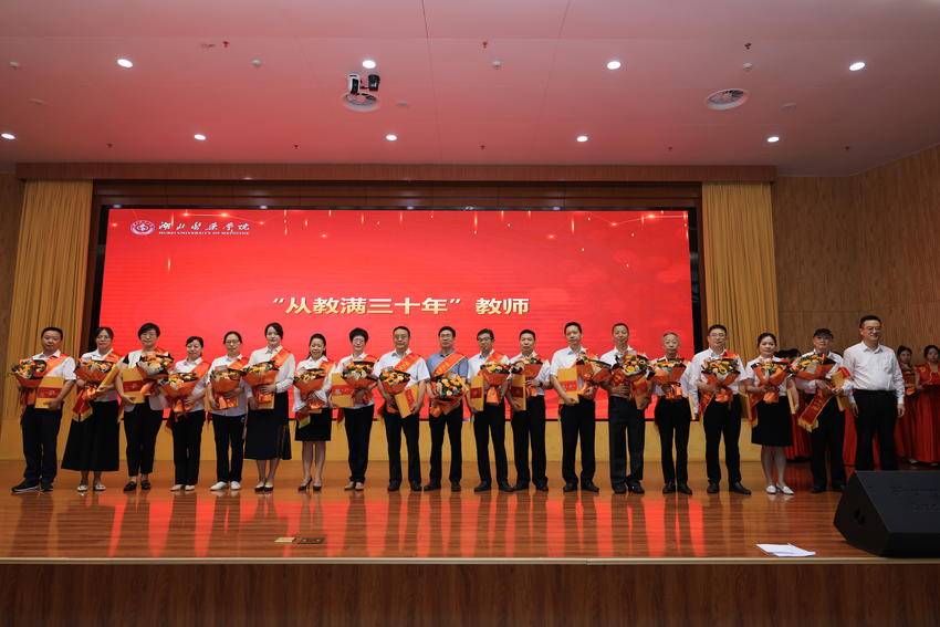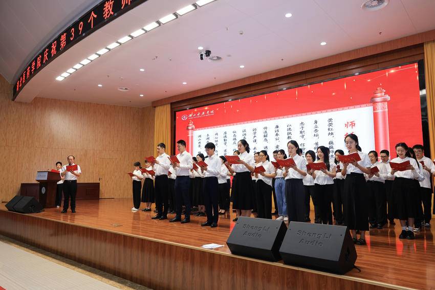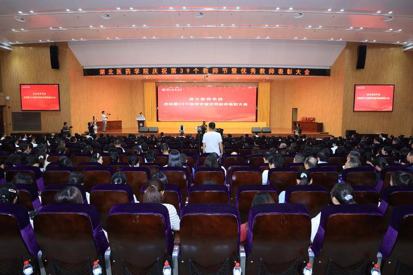 湖北日报客户端讯(通讯员 鲍晓宇)9月7日下午,湖北医药学院庆祝第39个教师节暨优秀教师表彰大会在科教楼学术报告厅举行。全体校领导、各附属医院领导、2023年“荣休”人员、“从教满三十年”教师、2023年“记功”奖励人员、新进教职工、各类获奖教师,以及副处级以上干部、副高以上职称人员、全体无课专任教师、学生代表齐聚一堂,共贺节日、表彰先进、展望未来。大会由党委常委、副校长严世荣主持。