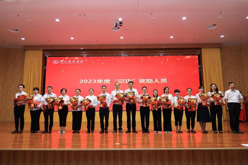 大会进行颁奖环节,附属十堰市妇幼保健院院长曾传军为第八届“优秀教学奖”、第三届“教师教学创新大赛”获奖教师代表颁奖;附属随州市中心医院党委书记徐俊秋为2022-2023学年优秀辅导员颁奖;校长助理、附属襄阳市第一人民医院党委书记、第四临床学院院长廉凯为2023年“记功”奖励人员颁奖;党委委员、校长助理、直属附属人民医院党委书记钟森为2023年“优秀硕士生导师”颁奖;党委委员、直属附属太和医院院长唐以军为2023年“师德标兵”颁奖;党委常委、纪委书记、湖北省监察委员会驻湖北医药学院监察专员徐荣为“从教满三十年”教师代表颁奖;党委常委、副校长、直属附属太和医院党委书记罗杰为省级先进个人李艳、孟忠吉颁奖;党委常委、副校长李云霞为省级教学成果奖团队颁奖;正校级干部、原党委书记涂汉军为省级教学质量工程获奖教师代表颁奖;党委副书记、校长王云甫为国家级教学质量工程获奖者颁奖。此次大会共表彰约200人。