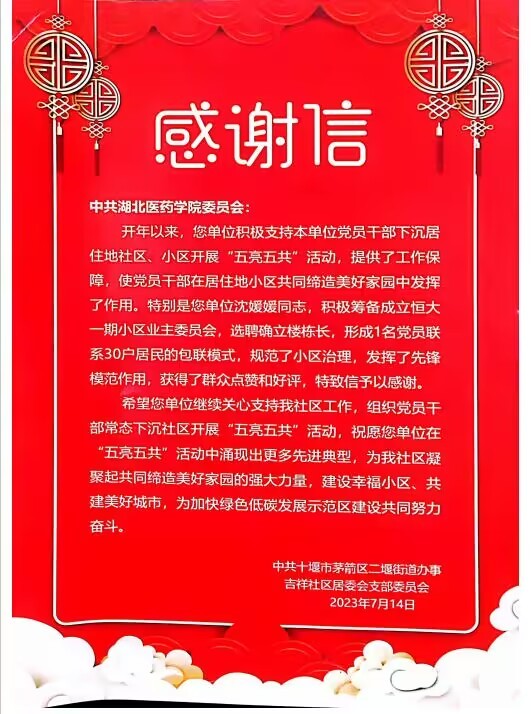 “开年以来,您单位积极支持本单位党员干部下沉居住地社区、小区开展‘五亮五共’活动,提供了工作保障,使党员干部在居住地小区共同缔造美好家园中发挥了作用。”近日,十堰市茅箭区吉祥社区将一封感谢信送到湖北医药学院,感谢该校党员干部在“五亮五共”活动中为吉祥社区群众办实事、解民忧、暖民心。