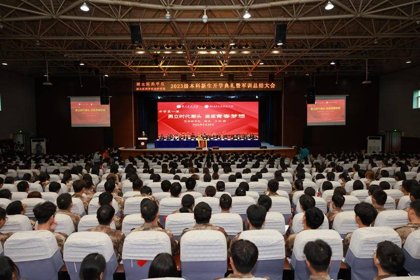 湖北日报客户端讯(通讯员 蒋寿欢)9月24日上午,湖北医药学院、湖北医药学院药护学院2023级本科新生开学典礼暨军训总结大会在学子会馆三楼举行,科教楼学术报告厅、五号教学楼教室同步直播。全体校领导,各职能部门负责人,各学院主要负责人出席活动,各新生班级辅导员和全体新生参加活动。大会由党委常委、组织部部长张海蛟主持。
