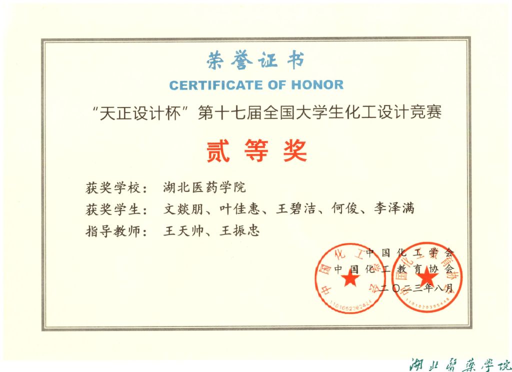 本网讯(通讯员 王天帅)近日,第十七届全国大学生化工设计竞赛圆满落幕。药学院制药工程专业学生文燚朋、叶佳惠、何俊、李泽满、王碧洁组成的“一定药行”团队在王天帅、王振忠老师指导下荣获全国二等奖。