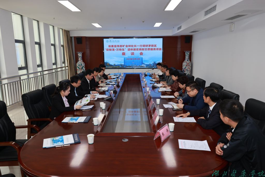 本网讯(文/刘莹 图/鲍晓宇)10月12日上午,湖北省委宣传部文明创建一处处长旷会祥一行来校调研“巨鲸落·万物生”遗体器官捐献志愿服务项目。十堰市茅箭区委副书记、区长李琴,市创文办常务副主任、市城市文明创建中心副主任王天军,市创文办副主任、市城市文明创建中心副主任齐斌成,茅箭区委常委、宣传部部长李锋等陪同调研。我校党委书记郑丹凤,党委常委、副校长严世荣及宣传部、基础医学院等单位负责人参加调研。