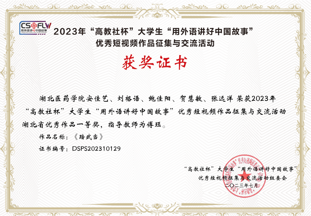 本网讯(通讯员 傅珏)日前,2023年“高教社杯”高等学校(本科)“用外语讲中国故事”优秀短视频作品征集活动省级获奖名单出炉,由湖北医药学院人文社会科学学院心理学系的安佳艺、刘格语、鲍佳阳、贺慧敏和张远洋同学制作,傅珏老师指导的短视频作品《踏武当》荣获省级一等奖。