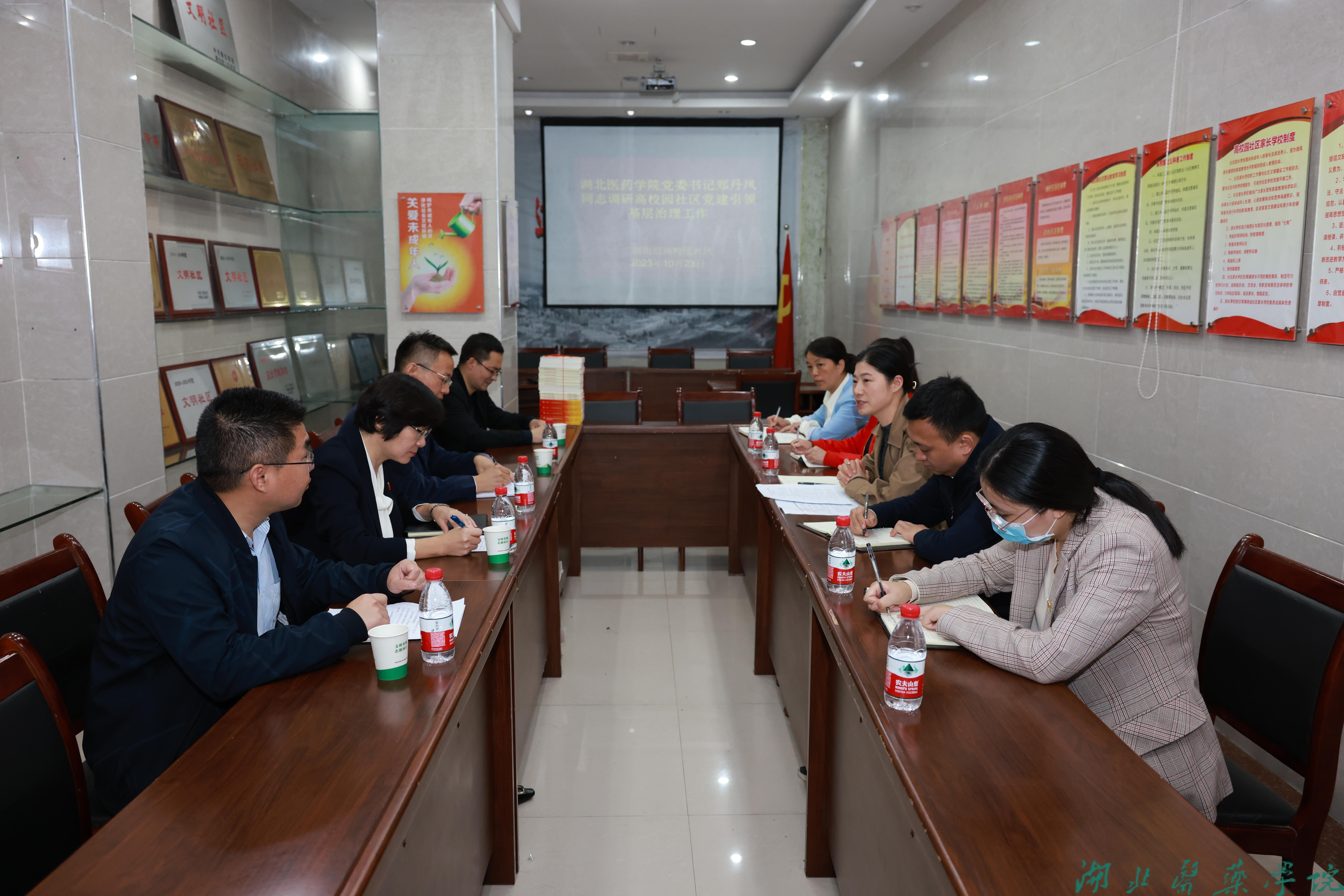 郑小燕介绍高校园社区基本情况、社区所辖小区党建+邻里中心建设情况、小区党支部建设情况、党员下沉社区开展“五亮五共”活动情况、小区物业共管账户情况等。茅箭区二堰街道党工委副书记、主任黄紫君对湖北医药学院对社区工作的支持表示感谢,希望高校园社区要进一步加强服务高校、进一步加强校地合作、进一步加强共建共治共享。