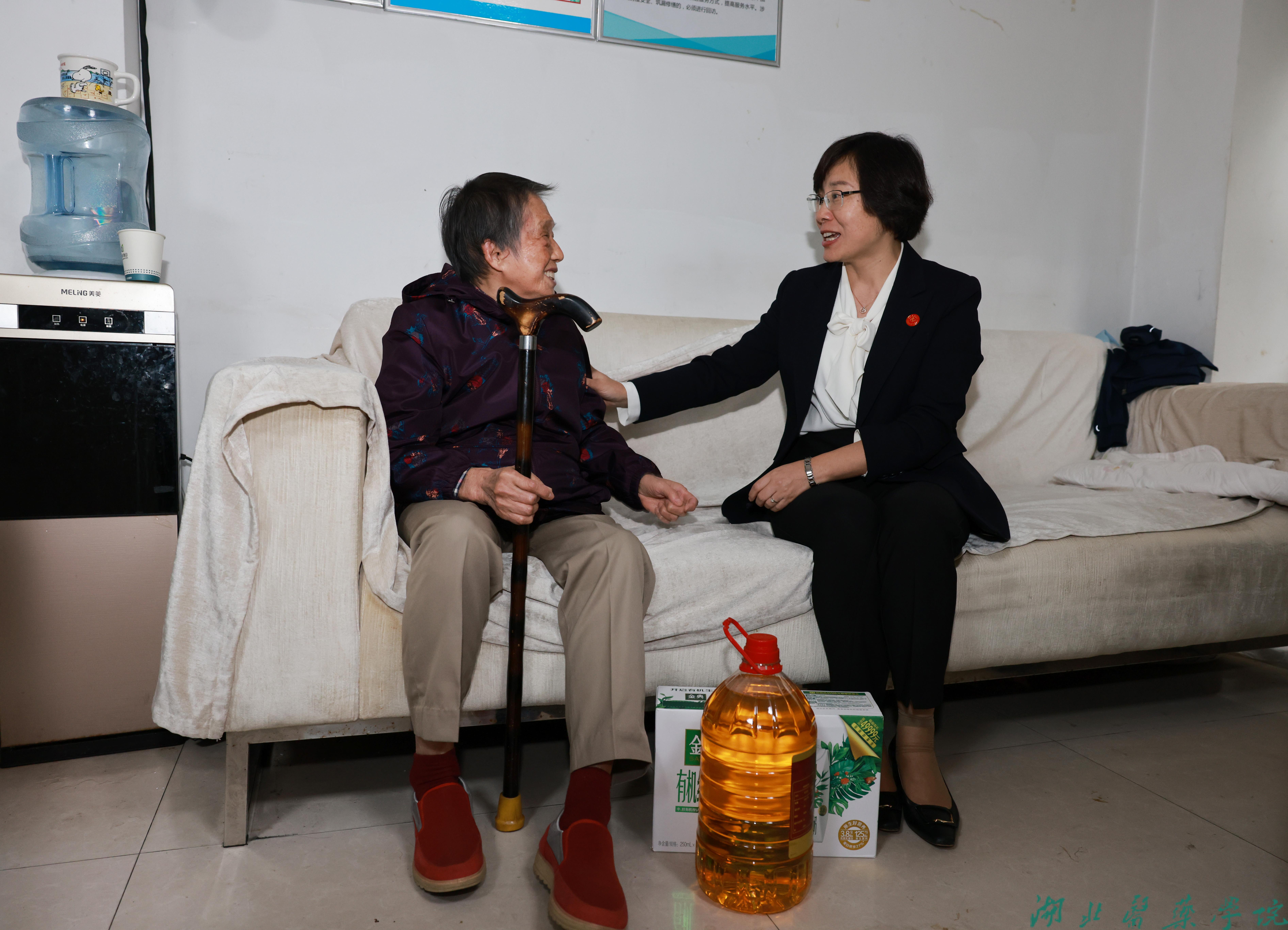 在爱丽舍小区,郑丹凤、王云甫分别携带食用油、牛奶等礼品看望“认亲”对象王新妹、颜显荣两位老人,关心他们身体状况,祝愿他们健康长寿、幸福美满。