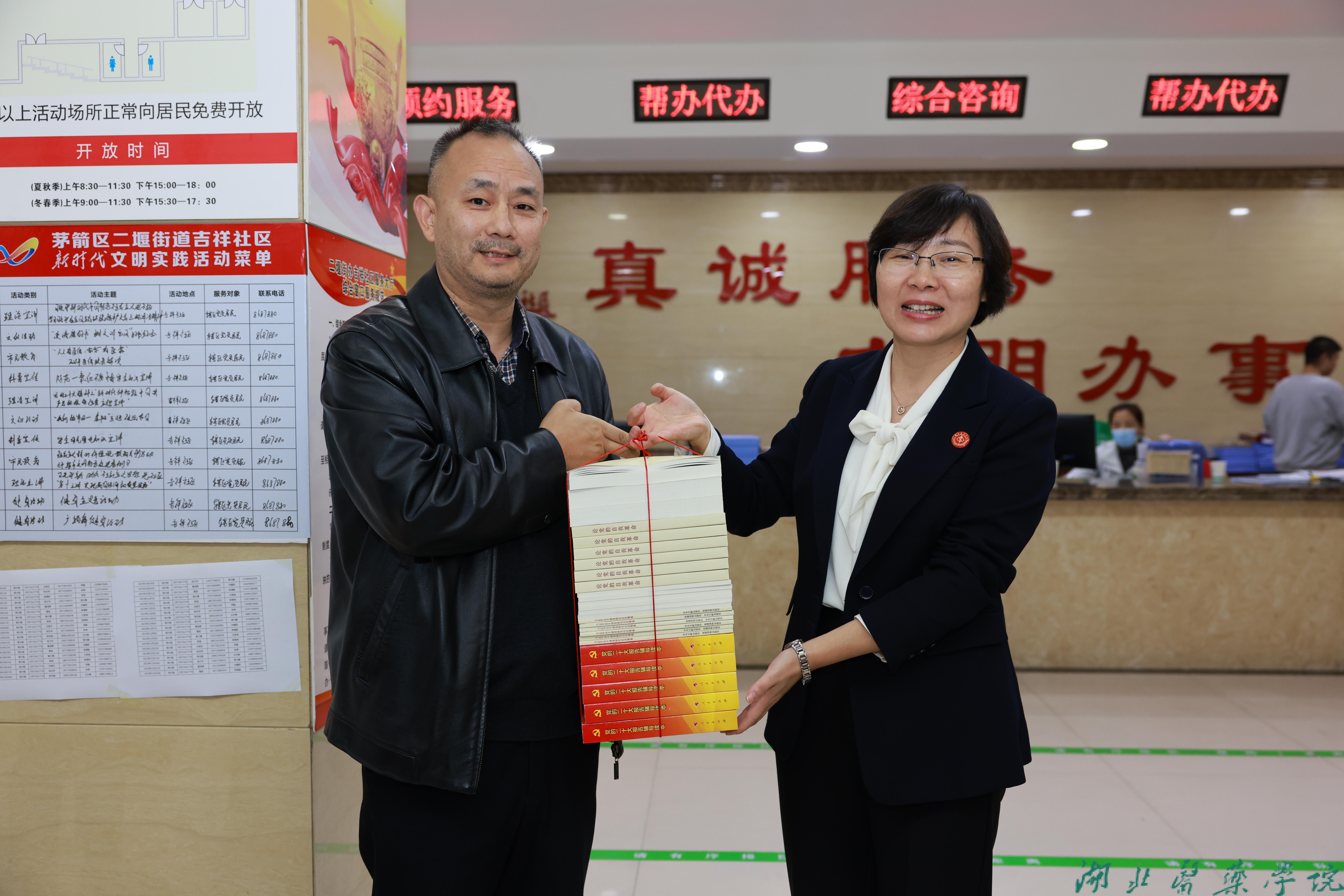 在吉祥社区办事大厅,郑丹凤看望社区干部、社区工作者,了解我校包联吉祥社区工作情况,代表学校向高校园社区捐赠主题教育指定学习书籍。