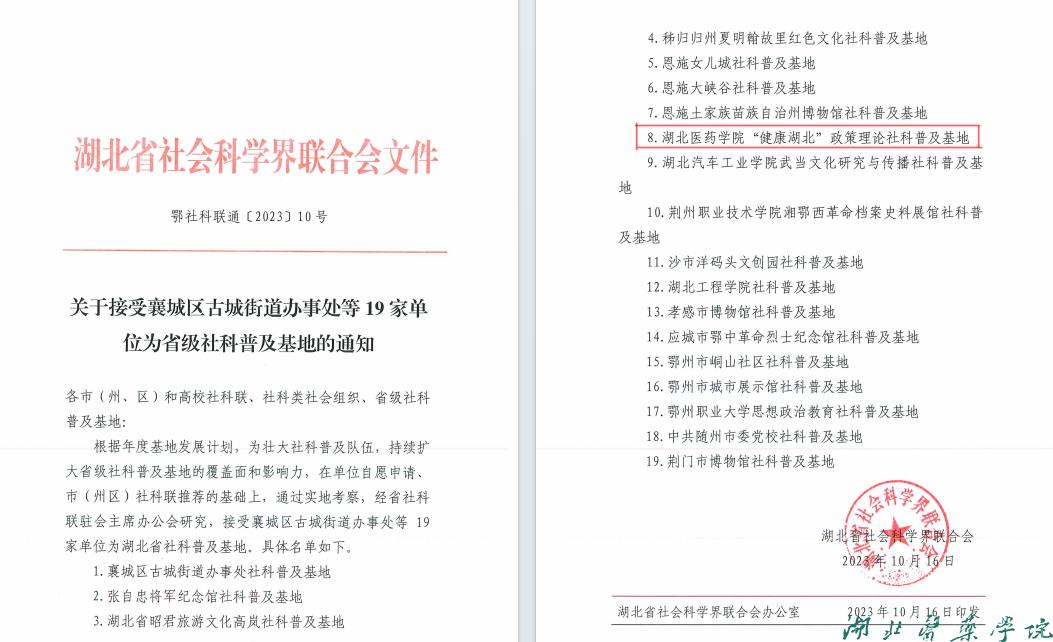 经过省社科联材料审查、专家评审,我校“健康湖北政策理论社科普及基地”凭借完善的场所设施、多元的社科普及载体、优秀的社科工作队伍、丰富的社科普及内容以及特色的社科普及活动等优势,从全省39家申报单位中脱颖而出,获批成为湖北省19家社会科学普及基地之一。