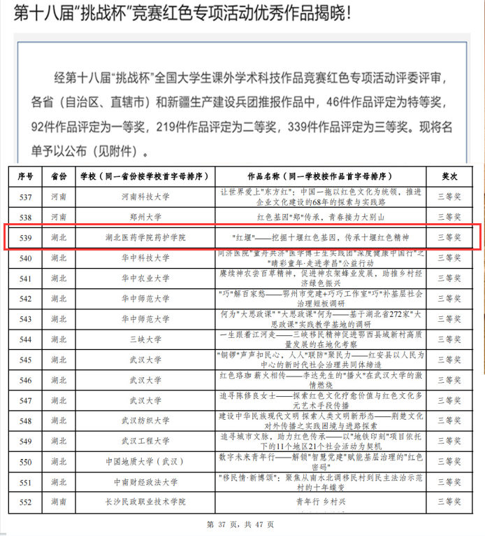 本网讯(通讯员 田家瑞 张艺瀛)近日,第十八届“挑战杯”全国大学生课外学术科技作品竞赛红色专项活动优秀作品名单公布,湖北医药学院“红堰——挖掘十堰红色基因,传承十堰红色精神”项目(负责人:药学院 张雨,指导老师:郭俊、张玉萌、韩慧)荣获国赛三等奖。