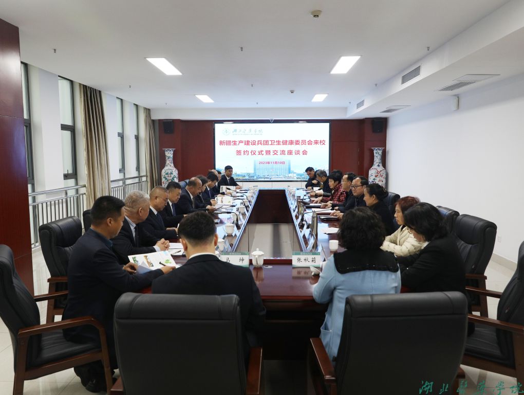 本网讯(通讯员 黄松鹤)11月10日,新疆生产建设兵团卫生健康委员会党组副书记、主任艾麦尔江·吐尼牙孜一行来校,双方在科教楼1708会议室举行签约仪式暨交流座谈会。党委副书记、校长王云甫,原党委书记涂汉军,党委常委、统战部部长谭艳出席并见证签约。签约仪式由党委常委、副校长严世荣主持。