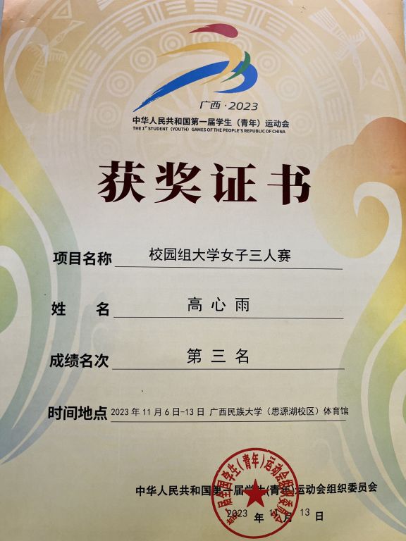 本届运动会由教育部、体育总局、共青团中央主办,每四年一届,是我国影响力最大、级别最高的学生运动会。本次毽球三人赛一共有来自于北京、上海、香港、天津等19支代表队参赛。作为球队二传手,高心雨过硬的二传技术和稳定的赛场发挥,为球队多次创造了良好的进攻机会,并率领球队战胜多个对手,以小组第一的成绩出线,在第二阶段的淘汰赛中,队员们奋力拼搏战胜贵州队挺进四强,一路屡经鏖战斩获季军。