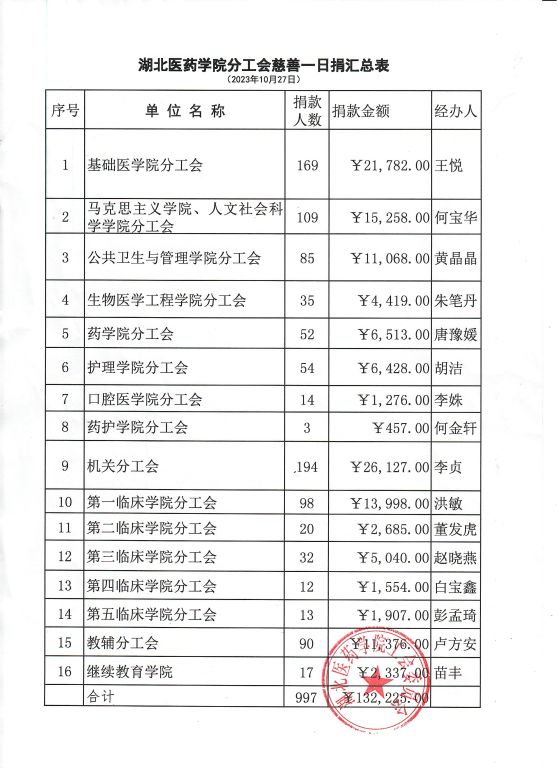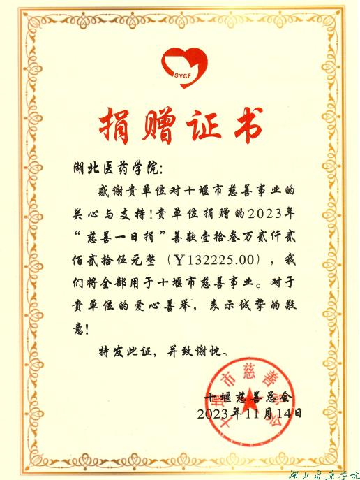 本网讯(通讯员 柯琴)为弘扬中华民族扶危济困、积德行善的传统美德,按照十堰市《关于2023年“慈善一日捐”活动方案》的要求,我校积极响应认真组织,在各分工会的大力支持下,截至10月23日,共收到16个分工会捐赠善款132225.00元,日前已由财务处将捐赠的资金汇款到十堰市慈善总会捐赠账号。