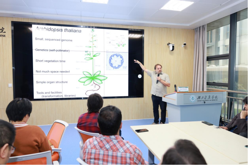 随后,Eva Benkova教授专题介绍奥地利科学技术研究所的研究领域及博士和实习培训项目。Jiri Friml教授为我校师生做题为The Phytohormone Regulatory Mechanisms of Plant Stem Cells - From Model Plants to Medicinal Plants的学术报告。Jiri Friml教授围绕植物干细胞调控中最重要的激素生长素,介绍通过模式植物研究揭示的机制,探讨这些发现在药用植物领域的应用潜力。