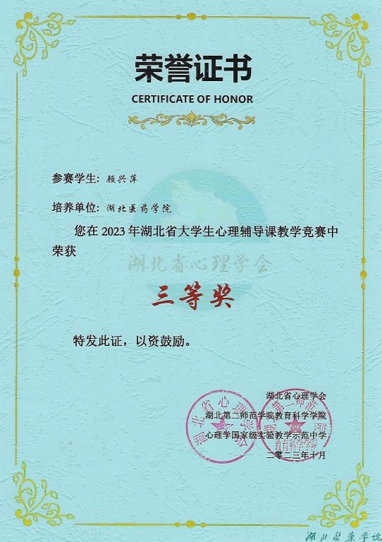 本网讯(通讯员 安佳艺 韩丽萍)近日,2023年湖北省大学生心理辅导课教学竞赛获奖名单公布,我校应用心理学专业的安佳艺、曹晶、顾兴萍、唐可心四位学生荣获省级三等奖。