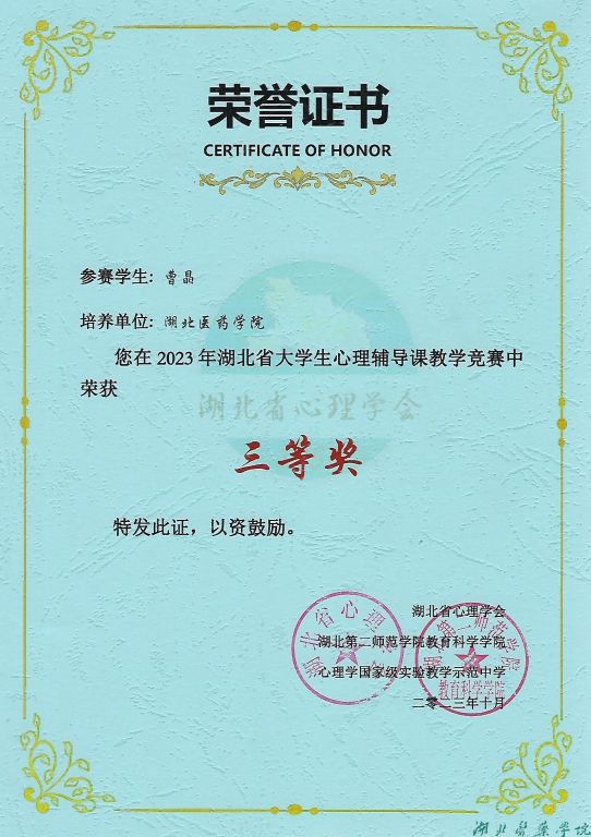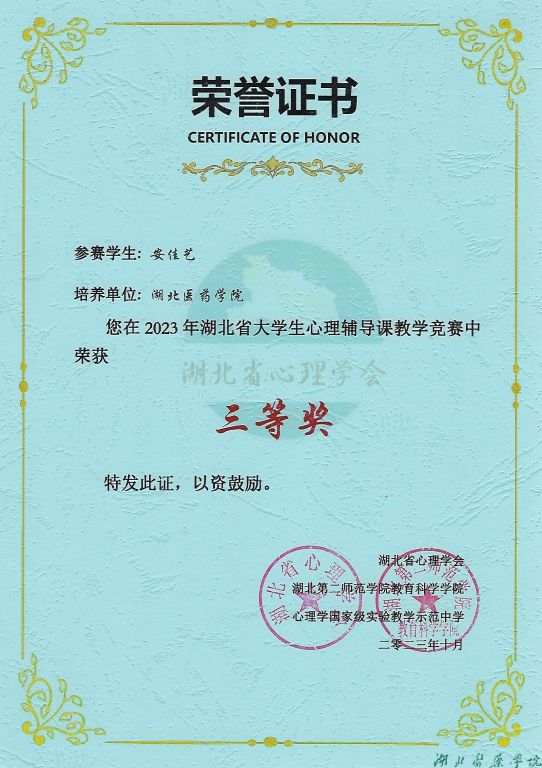 本网讯(通讯员 安佳艺 韩丽萍)近日,2023年湖北省大学生心理辅导课教学竞赛获奖名单公布,我校应用心理学专业的安佳艺、曹晶、顾兴萍、唐可心四位学生荣获省级三等奖。