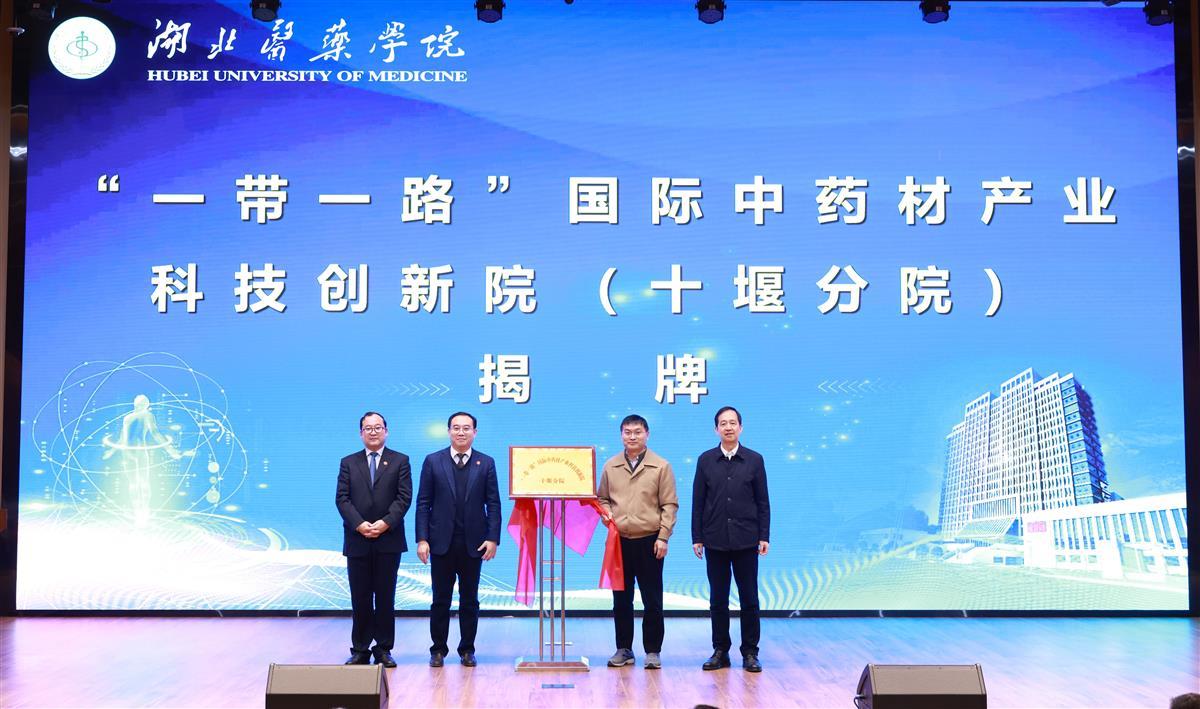 “一带一路”国际中药材产业科技创新院院长胡学博,湖北医药学院党委副书记、校长王云甫,鄂西北生物医药产业技术研究院院长涂汉军,直属附属人民医院党委书记钟森共同为“一带一路”国际中药材产业科技创新院(十堰分院)揭牌。